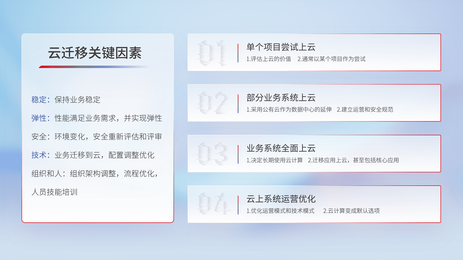 结合实际业务,,,,从规划设计、、云平台选型、、、、云原生改造、、、数据迁移、、、集成交付,,迁移全过程为客户识别最佳上云路径,,,做好风险识别管理,,,设计网络架构、、、身份权限、、、、安全审计合规、、、、操作审计、、日志审计、、、监控告警策略、、、、多站点容灾设计等,,,,对云上基础设施进行整体规划,,提升IT治理水平,,,,以满足弹性、、、、高可用、、、高性能的需求。。。