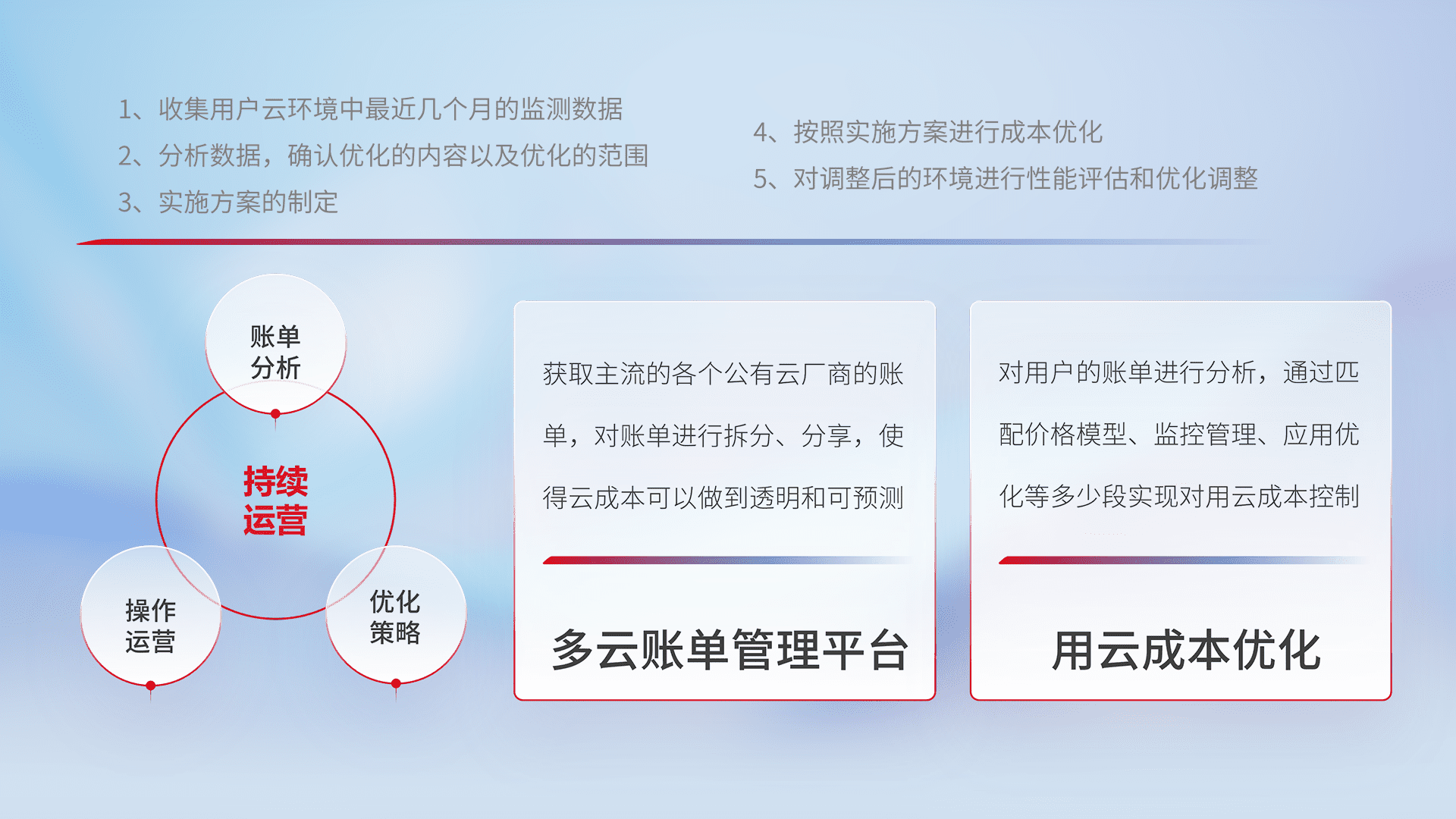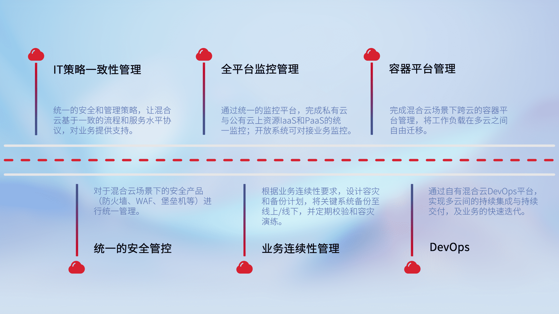 通过多云纳管,,以统一的资源数据模型把客户的云资源进行抽象和封装,,,进而实现对多云资源的统一操作,,,保障云资源管理的可靠性、、、、稳定性与可用性。。量身定制化运维内容,,,配置、、、开发运维、、、补丁管理、、备份、、、监控、、、认证和访问管理、、、、审计和日常巡检等,,,,保障在用云过程中的可靠度,,,稳定度以及高可用率。。